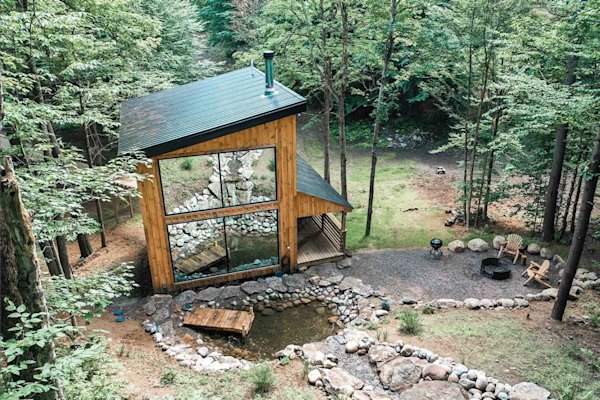 This uniquely-shaped Massachusetts rental boasts a wood-burning fireplace floor-to-ceiling windows and an impressive 7 acres of private property. Modern Treehouse vacation rental in the Catskills. The bathroom features a composting toilet and theres an outdoor shower.